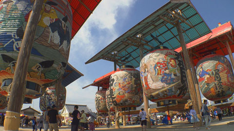 愛知県西尾市の三河一色諏訪神社で毎年夏に行われる「三河一色大提灯まつり」。境内に6組12張掲げられる提灯は、最大で直径5.6メートル、長さ10メートルを誇ります。かつては「一色のばかぢょうちん」とも呼ばれ、愛知県の有形民俗文化財に指定されています。大提灯を町一体で掲げ、提灯の灯とともに祭りを未来へ繋ぐ人々を伝えます。