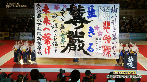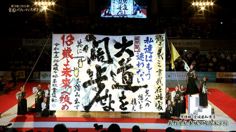 一筆に想いをかけた高校生たちが、音楽に合わせて、6分間で縦4m×横6mの紙に作品を書き上げ、作品の出来栄えはもちろん所作の美しさや構成力・演技力などを競いました。