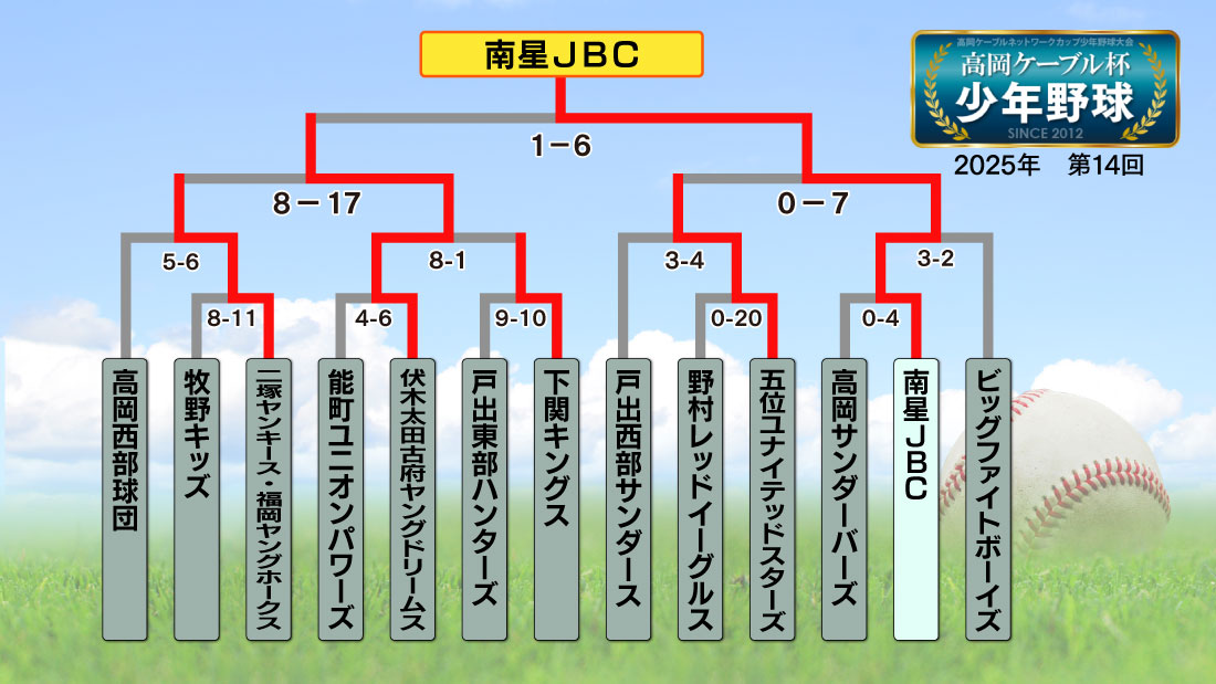 第14回高岡ケーブルネットワークカップ少年野球大会は、10月13日(月・祝)、城光寺野球場で開幕し、二塚・福岡の連合チームを含む13チームが熱戦を繰り広げました。決勝は11月1日(土)、伏木太田古府ヤングドリームスと南星JBCが対戦し、南星JBCが6対1で勝ちました。11月8日と9日の午前9時、午後4時から大会ダイジェスト番組を放送します。