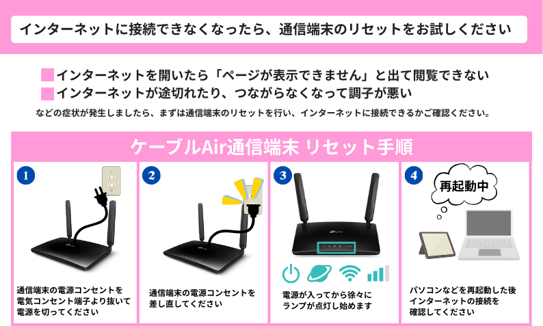 上記作業時間を過ぎても各サービスがご利用いただけない場合はお手数をおかけしますが下記の手順に沿って通信機器の再起動をお試し下さい。