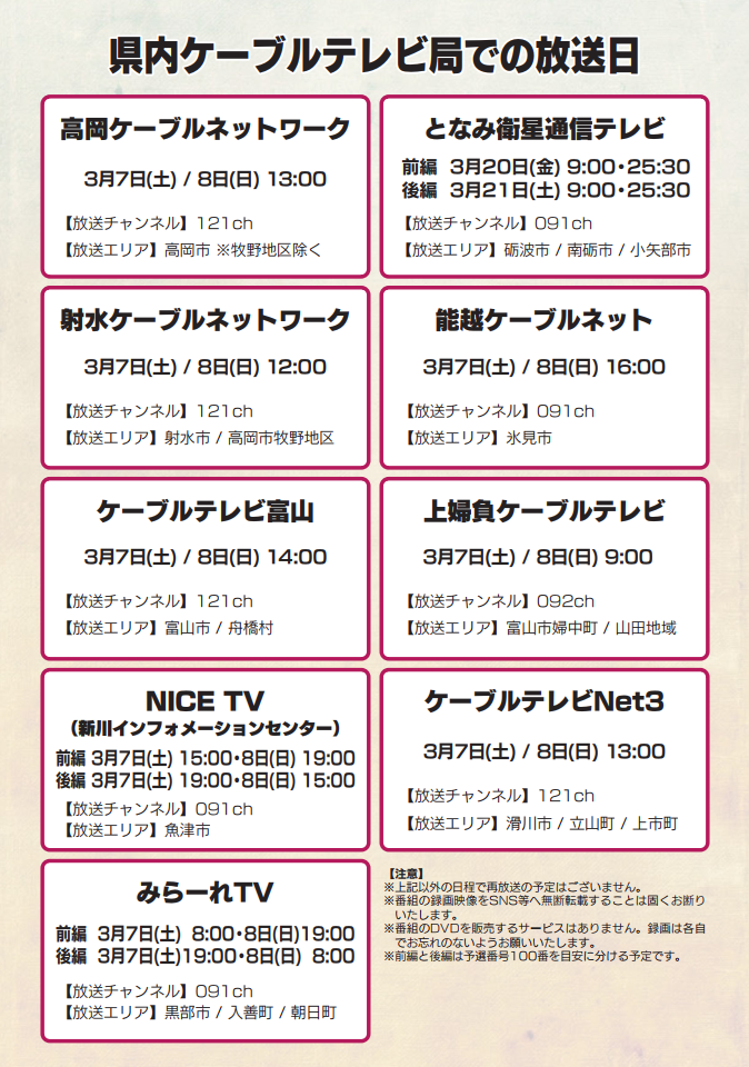 ホームすべてのお知らせコミュニティチャンネル NHKのど自慢予選会 放送日のお知らせ コミュニティチャンネル NHKのど自慢予選会 放送日のお知らせ 2026年02月21日コミュニティチャンネル 県高岡文化ホールで2月21日(土)に収録した「NHKのど自慢予選会」を放送します。番組は予選会に出場した200組のうち、当日会場で放送許諾をいただいた方のみを放送するものです。下記日程以外に再放送はありませんので、お見逃しなく。県内各ケーブルテレビでの放送日程はこちら。■放送日 3月7日(土)・ 8日(日) いずれも 午後1時から■チャンネル 121ch 戻る