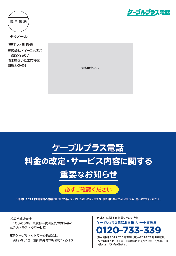 月額基本料金の改定対象となるお客様には、2025年8月末日時点のご契約に基づきご案内書面を10月下旬に順次対象のお客様へお送りいたします。行き違いで書面のお届けがあった場合はご容赦ください。