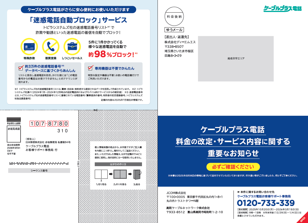 2026年1月より、「迷惑電話自動ブロック」はケーブルプラス電話の月額基本料金に標準付帯となるため、これまで本サービスを有料でご利用いただいていたお客様は、追加料金なしで引き続きご利用いただけます。