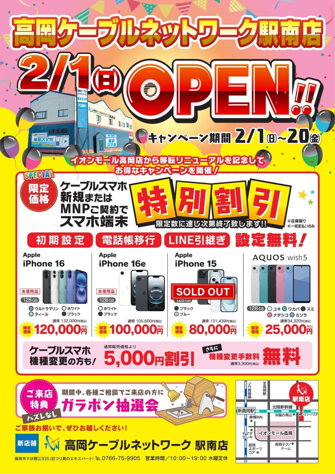 新店舗「高岡ケーブルネットワーク 駅南店」が、2026年2月1日(日)あさ10時にオープンいたします。
