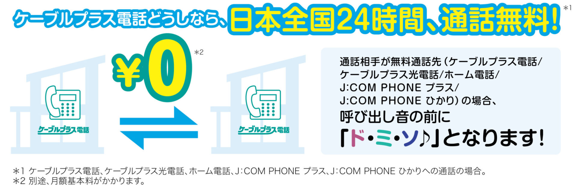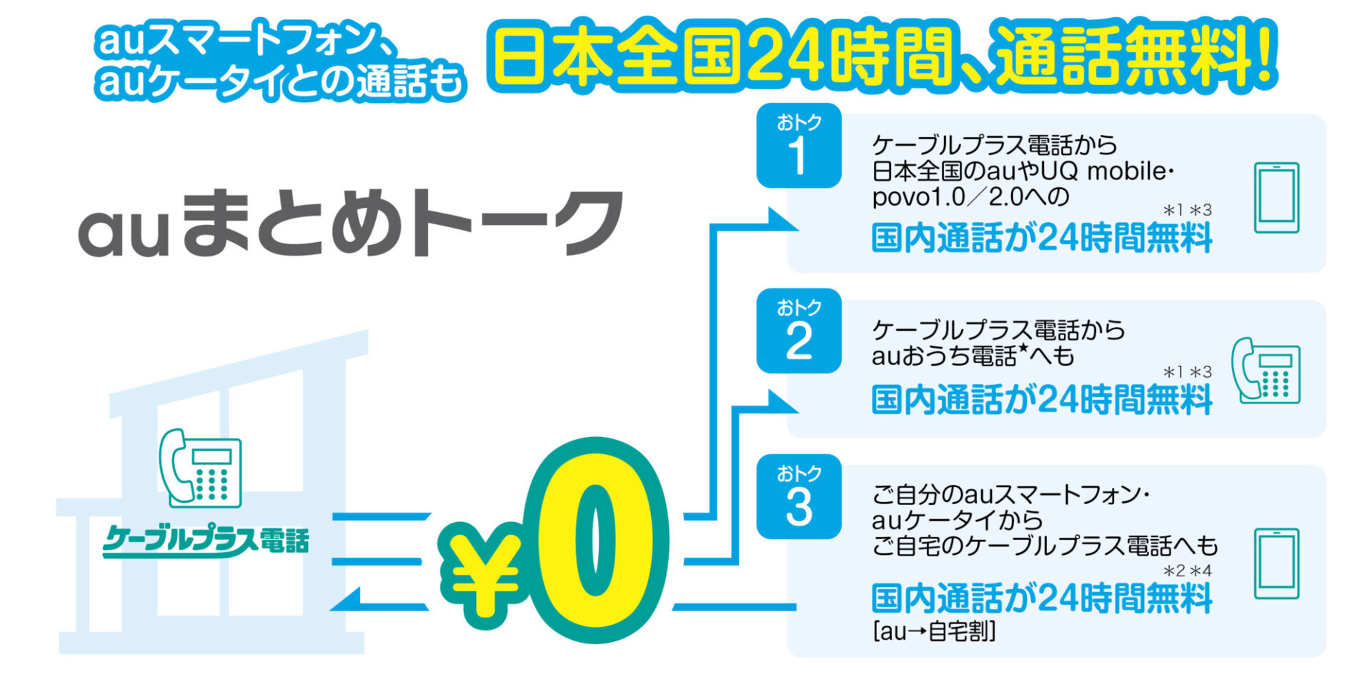 【その他料金に関するご注意事項】au携帯電話とケーブルプラス電話の月額基本料およびユニバーサルサービス料が別途必要となります。 詳しくはauホームページをご確認ください。