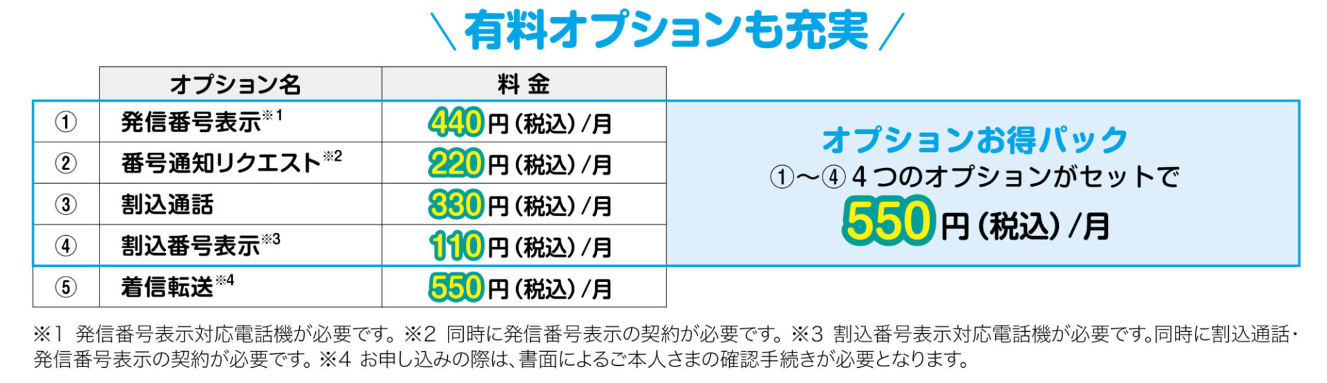 発信番号表示、番号通知リクエスト、割込通話、割込番号表示の4つのサービスがセットになったおトクなオプションパックです。